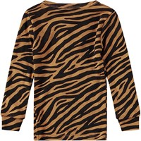 Schwarzer und orangefarbener Pullover aus Öko-Merinowolle für die Kleinen. Der Pullover hat lange Ärmel mit gerippten Bündchen und zwei Druckknöpfe auf der linken Schulter, was das Anziehen erleichtert. Zusätzlich hat der Pullover ein Zebra-Muster.