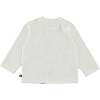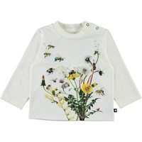 Enovan ist ein weißer Babypullover mit Druck von wilden Blumen und Insekten. Enovan hat einen Knopfverschluss an einer Schulter und dunkelblaue Ärmel und einen Rücken.