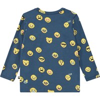 Dunkelblaue Bluse für die Kleinen aus Öko-Baumwolljersey mit einem Allover-Print süßer Pixel-Emojis. Die Bluse hat lange Ärmel und Druckknöpfe am Hals, was das An- und Ausziehen erleichtert.