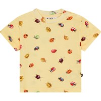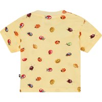 Gelbes klassisches T-Shirt für die Kleinen aus Öko-Baumwolle. Das T-Shirt hat eine lockere Passform, einen Rundhalsausschnitt mit geripptem Rand und zwei Druckknöpfe an der linken Schulter, die das Anziehen erleichtern. Das T-Shirt hat einen süßen Allover-Print aus Marienkäfern, Schnecken und Käfern in verschiedenen Farben. Farben.