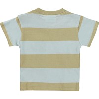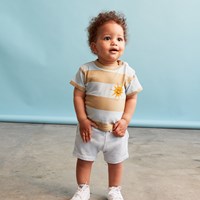 Enzo ist ein gestreiftes Baby-T-Shirt in Blau und Grün mit einem fröhlichen Sonnenaufdruck auf der Brust. Enzo hat einen doppelten Knopfverschluss an einer Schulter, was das An- und Ausziehen des Shirts erleichtert. Das T-Shirt ist weich und bequem und besteht aus einer Baumwoll-Leinen-Mischung.