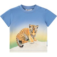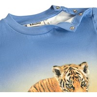 Klassisches blaues T-Shirt für die Kleinen, mit einem Tigerprint aus Bio-Baumwolle. Es hat eine lockere Passform, einen runden Halsausschnitt mit geripptem Rand und Druckknöpfe auf der linken Schulter, um das An- und Ausziehen zu erleichtern.