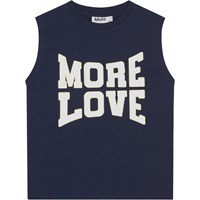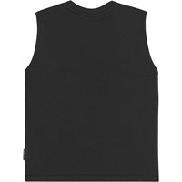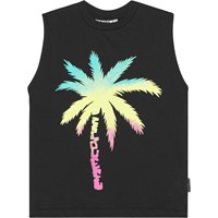 Schwarzes Tanktop aus weicher Öko-Baumwolle. Das Oberteil hat tiefe Armausschnitte und einen Palmenprint auf der Vorderseite.
