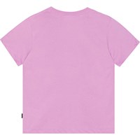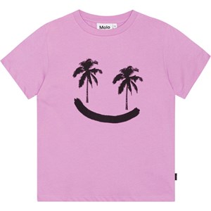 Lila T-Shirt aus weicher Öko-Baumwolle. Das T-Shirt hat einen lockeren und klassischen Schnitt und einen Rundhalsausschnitt mit Rippbündchen. Das T-Shirt hat auf der Vorderseite einen schwarzen Aufdruck mit einem lächelnden Gesicht und Palmenaugen.