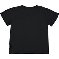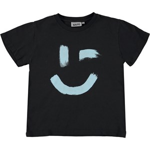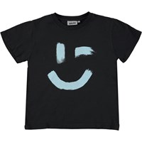 Rame ist ein schwarzes Unisex-T-Shirt mit einem Smiley-Aufdruck auf der Vorderseite. Das T-Shirt hat einen runden Halsausschnitt.