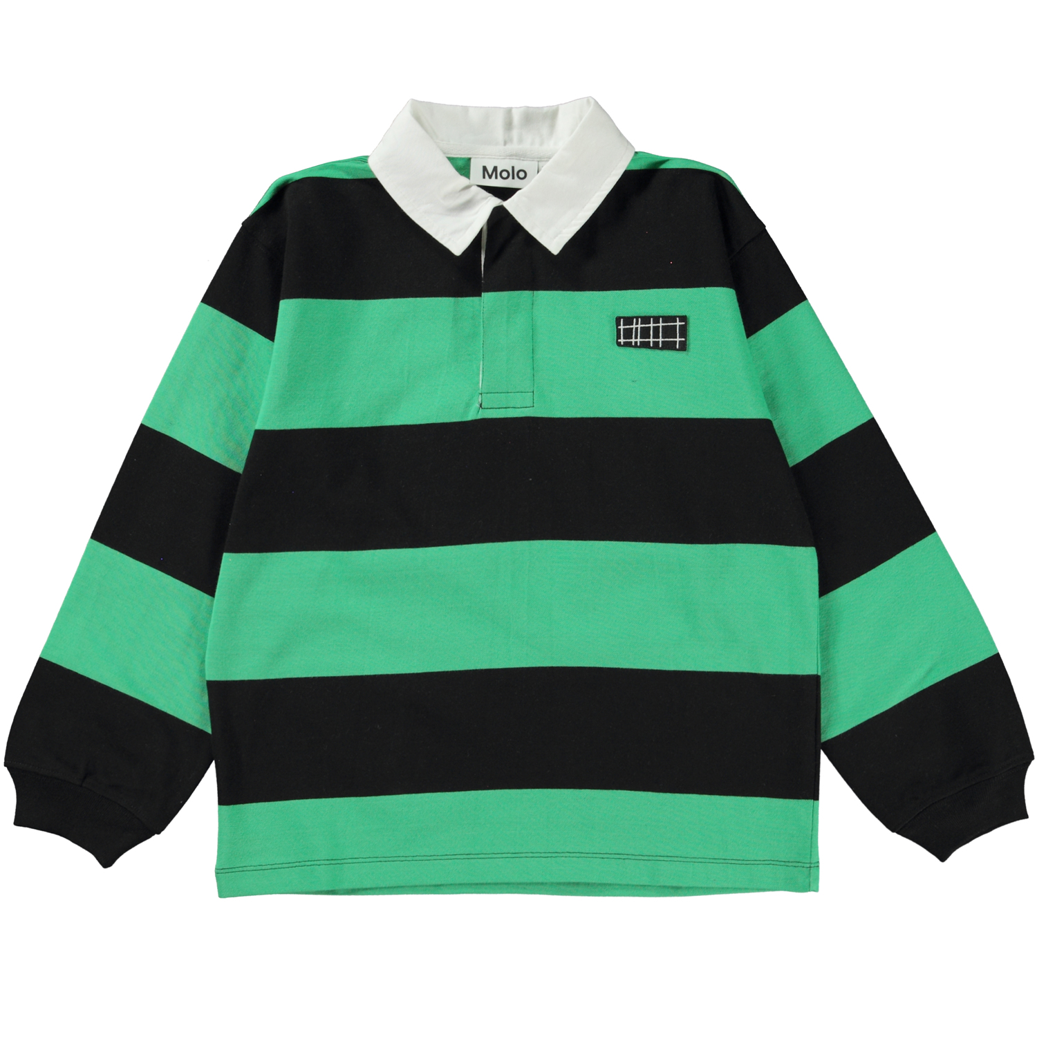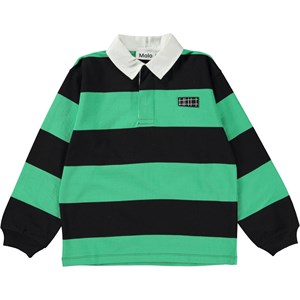 Relz ist ein breit gestreiftes Rugby-Shirt in Grün und Schwarz. Das Shirt hat einen weißen Kragen und lange Ärmel.