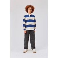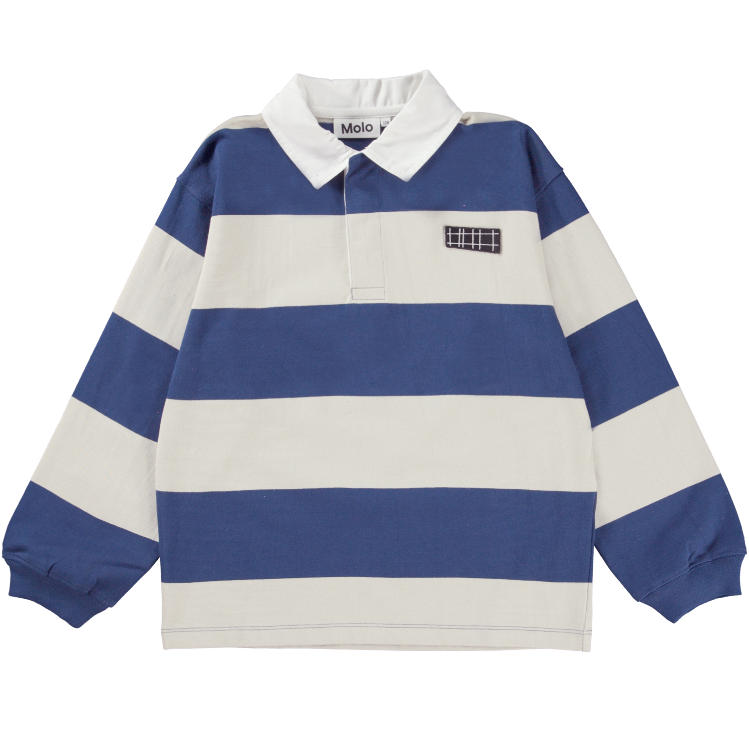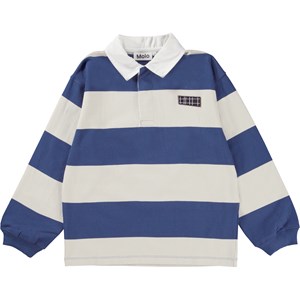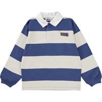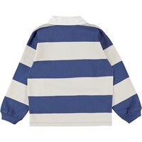 Relz ist ein breit gestreiftes Rugby-Shirt in Blau und Weiß. Das Shirt hat einen weißen Kragen und lange Ärmel.