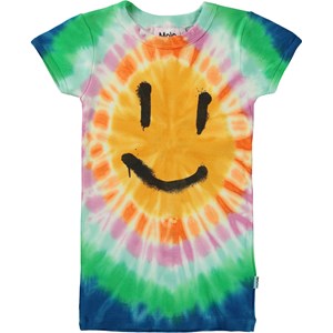 Rhiannon ist ein farbenfrohes Ringer-T-Shirt mit Batikdruck und einem Smiley in der Mitte. Alle Batikfarben von Molo sind handgefertigt und jedes Produkt hat daher seinen eigenen einzigartigen Ausdruck.