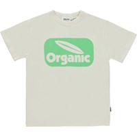 Riley ist ein cremefarbenes Unisex-T-Shirt mit einem grünen „Organic“-Logo auf der Vorderseite.
