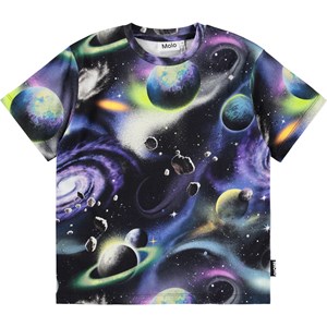 Schwarzes T-Shirt aus weicher Bio-Baumwolle mit kurzen Ärmeln und einem gerippten Ausschnitt. Das T-Shirt hat eine lockere Passform und einen Druck von Weltraum und Planeten in vielen Farben.