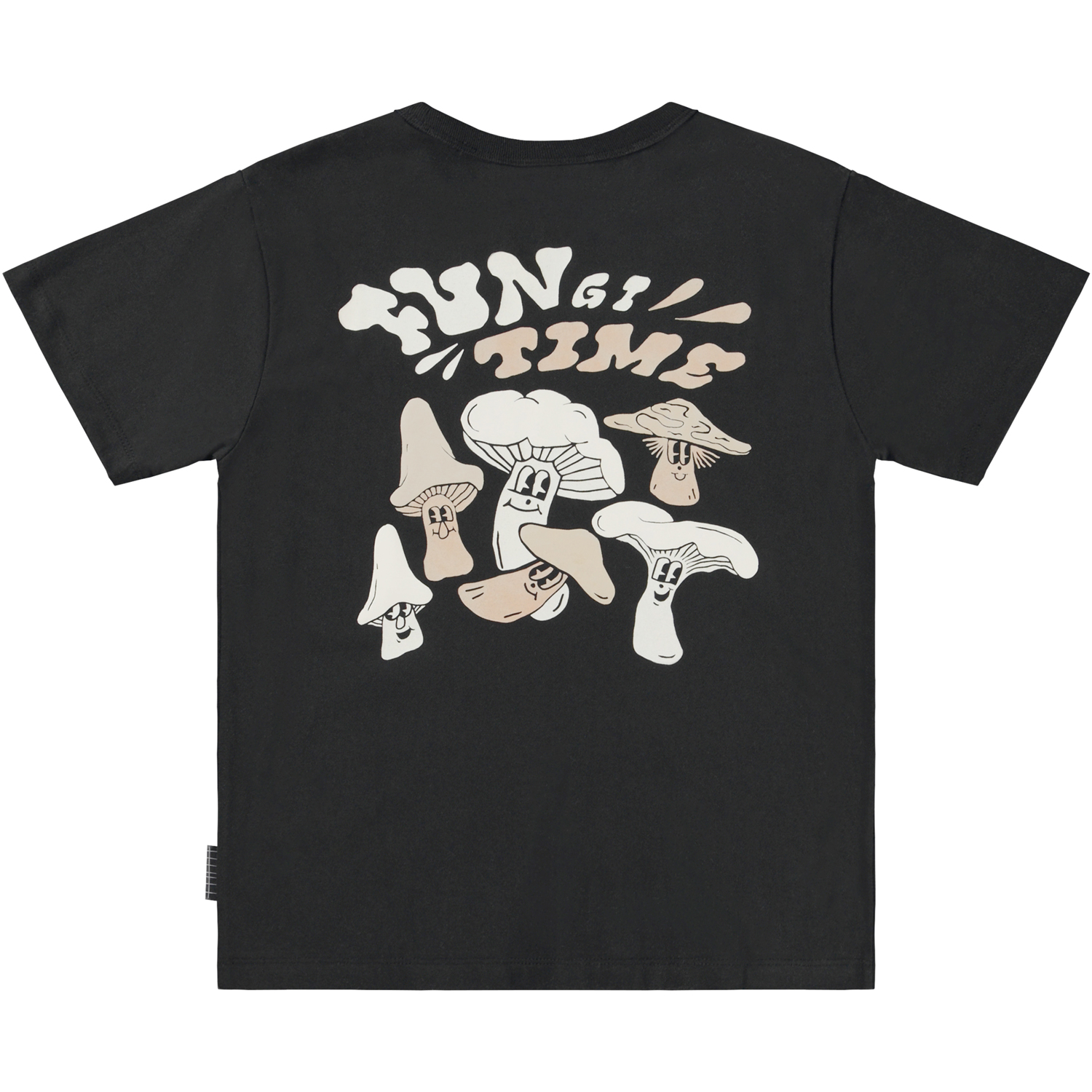 Schwarzes T-Shirt mit Placement-Print auf Vorder- und Rückseite. Der große Print auf der Rückseite besteht aus fröhlichen zweifarbigen Pilzen, die Spaß haben. Sie feiern eine Party und sind ziemlich funky. Oder sollte man "Fungi" sagen? Zwei der Pilze haben so wild getanzt, dass sie auf der Vorderseite des T-Shirts gelandet sind. Was für eine Party! Dieses T-Shirt besteht aus 100% Öko-Baumwolle, hat kurze Ärmel, einen Rundhalsausschnitt mit Rippbündchen und eine lockere Passform.