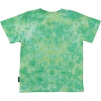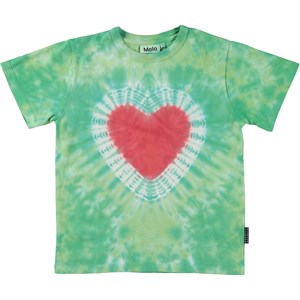 Riley ist ein übergroßes Unisex-T-Shirt mit einem grünen Batikdruck und einem roten Herz. Das T-Shirt hat kurze Ärmel und einen Rundhalsausschnitt. Alle Batikfarben von Molo sind handgefertigt und jedes Produkt hat daher seinen eigenen einzigartigen Ausdruck.