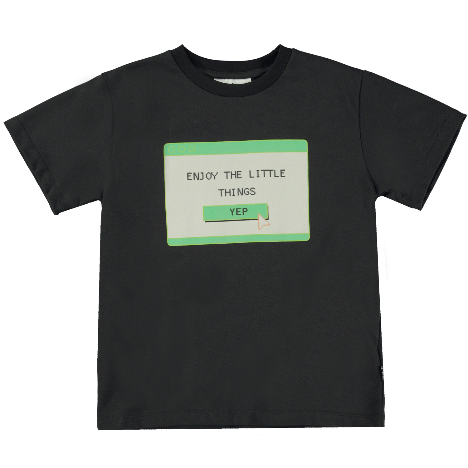 Schwarzes T-Shirt mit Retro-Computerdruck auf der Vorderseite. Der Druck ist ein grüner Placement-Print, der ein Computer-Popup-Fenster zeigt, in dem Du aufgefordert wirst, "Yep" zu drücken, um auch die kleinen Dinge zu genießen. Dieses T-Shirt besteht aus 100% Öko-Baumwolle, hat kurze Ärmel, einen Rundhalsausschnitt mit Rippbündchen und eine lockere Passform.