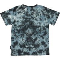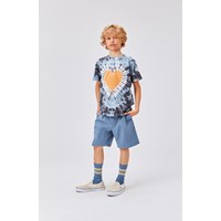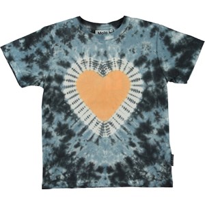 Riley ist ein übergroßes Unisex-T-Shirt mit blauem Batikdruck und rotem Herz. Das T-Shirt hat kurze Ärmel und einen Rundhalsausschnitt. Alle Batikfarben von Molo sind handgefertigt und jedes Produkt hat daher seinen eigenen einzigartigen Ausdruck.