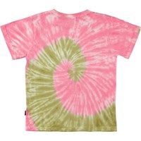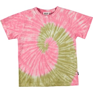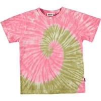 Riley ist ein übergroßes Unisex-T-Shirt in rosa Batik mit grünem Spiraldruck. Das T-Shirt hat kurze Ärmel und einen Rundhalsausschnitt. Alle Batikfarben von Molo sind handgefertigt und jedes Produkt hat daher seinen eigenen einzigartigen Ausdruck.