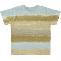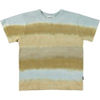 Riley ist ein übergroßes Unisex-T-Shirt mit einem gestreiften Batikdruck in Hellblau und verschiedenen Beigetönen. Das T-Shirt hat kurze Ärmel und einen Rundhalsausschnitt. Alle Batikfarben von Molo sind handgefertigt und jedes Produkt hat daher seinen eigenen einzigartigen Ausdruck.