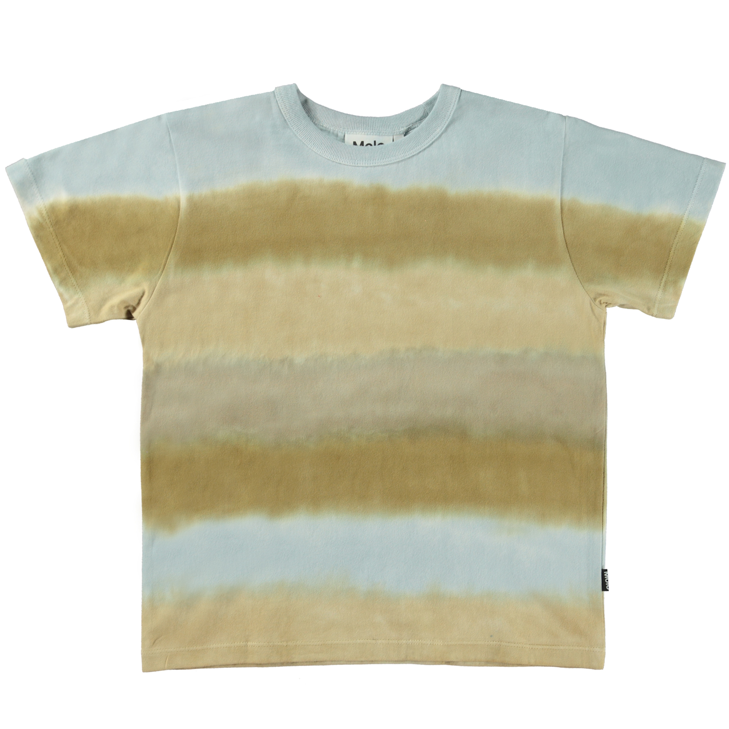 Riley ist ein übergroßes Unisex-T-Shirt mit einem gestreiften Batikdruck in Hellblau und verschiedenen Beigetönen. Das T-Shirt hat kurze Ärmel und einen Rundhalsausschnitt. Alle Batikfarben von Molo sind handgefertigt und jedes Produkt hat daher seinen eigenen einzigartigen Ausdruck.