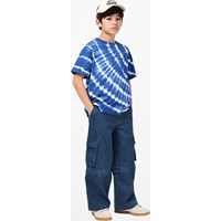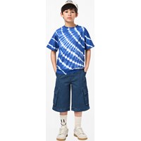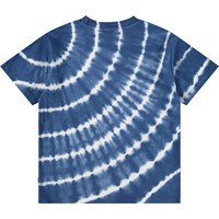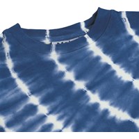Blaues T-Shirt aus weicher Bio-Baumwolle mit kurzen Ärmeln und geripptem Halsausschnitt. Das T-Shirt hat eine lockere Passform mit einem Batikmuster. Alle unsere Batikmuster sind handgefertigt, was ein einzigartiges Muster erzeugt, das von Stil zu Stil variiert.