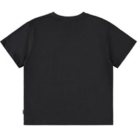 Schwarzes T-Shirt aus weicher Bio-Baumwolle mit kurzen Ärmeln und einem gerippten Ausschnitt. Das T-Shirt hat eine übergroße Passform mit einem Neon-Druck eines Alien-Gesichts.