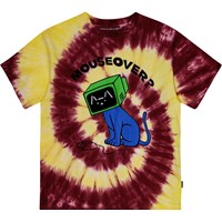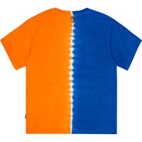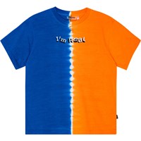 Blaues und orangefarbenes Batik-T-Shirt aus Öko-Baumwolle. Das T-Shirt hat kurze Ärmel, einen Rundhalsausschnitt und gerippte Verzierungen am Hals. Es hat eine übergroße Passform und einen aufgedruckten Text auf der Vorderseite mit der Aufschrift "I'm Real". Unsere Batik ist handgefertigt und erzeugt ein einzigartiges Muster, das von Stil zu Stil variiert.