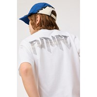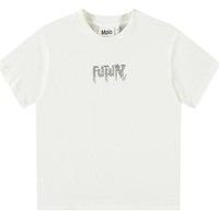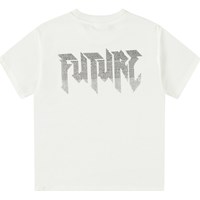 Weißes T-Shirt aus Öko-Baumwolle mit kurzen Ärmeln und geripptem Ausschnitt. Das T-Shirt hat eine lockere Passform mit dem Wort 'Future' in funkelnden Strasssteinen auf der Vorder- und Rückseite geschrieben.