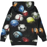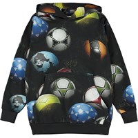 Romo ist ein Unisex-Hoodie in Schwarz mit einem Aufdruck aus bunten Fußbällen. Der Hoodie hat eine Kängurutasche auf der Vorderseite.