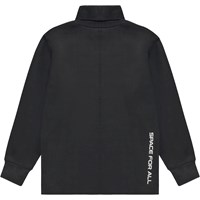 Schwarzer Rollkragenpullover mit weißem Placement-Print auf der Rückseite. Der Aufdruck lautet „Space for All“, eine Botschaft, die auf verschiedene Weise verstanden werden kann. Dieser Rollkragenpullover besteht aus 100% Baumwolle, hat lange Ärmel und eine reguläre Passform.
