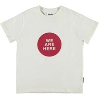 Roxo ist ein weißes Unisex-T-Shirt mit roten Kreisen auf der Vorderseite mit dem Text 'We are here'.