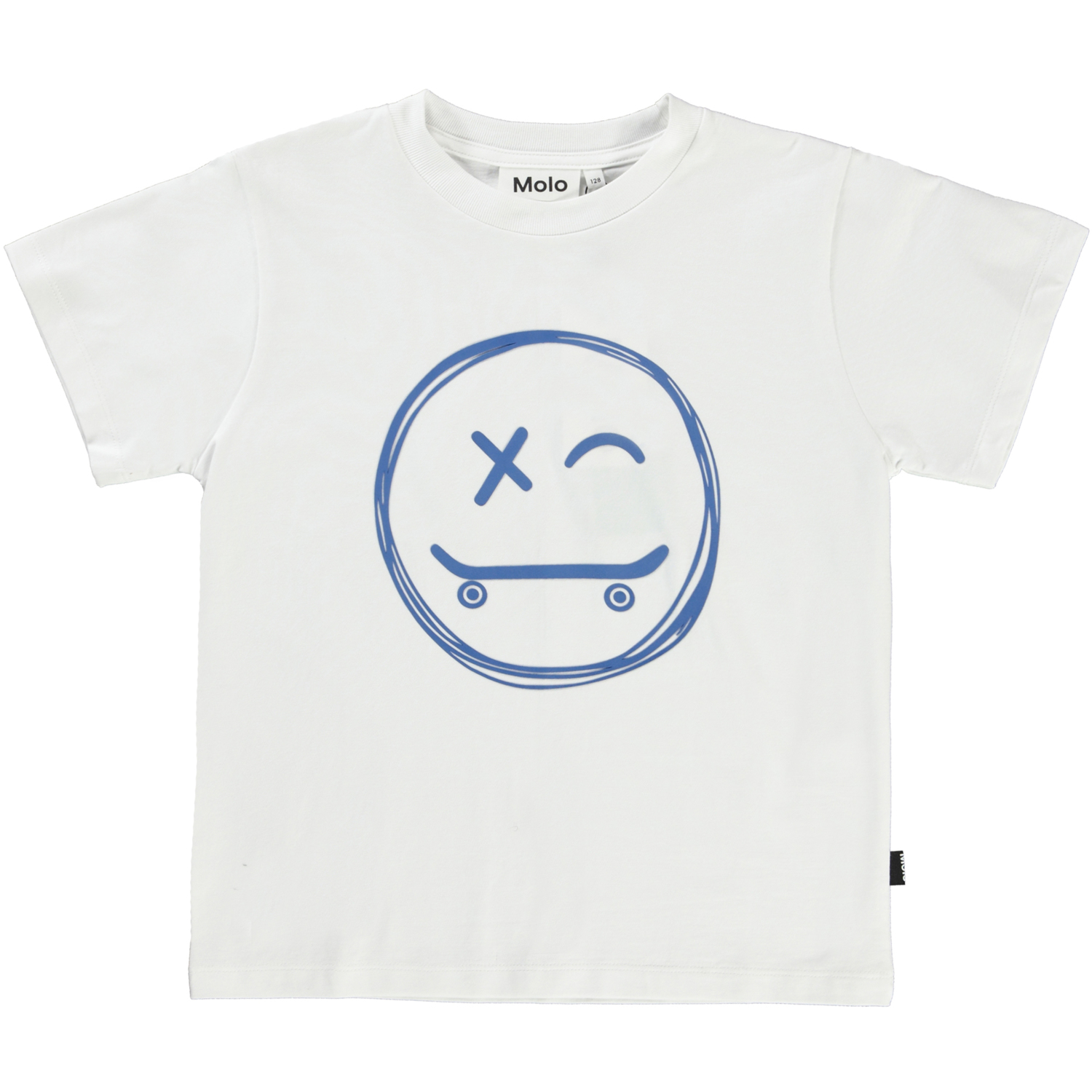Roxo ist ein weißes Basic-T-Shirt mit einem blauen Skater-Smiley auf dem Bauch.