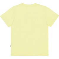 Gelbes Kurzarm-T-Shirt aus Öko-Baumwolle mit großem Smiley-Print auf der Vorderseite. Das T-Shirt hat einen Rundhalsausschnitt und eine normale Passform.