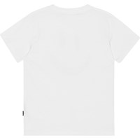 Weißes Kurzarm-T-Shirt aus Öko-Baumwolle mit großem Smiley-Print auf der Vorderseite. Das T-Shirt hat einen Rundhalsausschnitt und eine normale Passform.