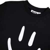 Schwarzes T-Shirt aus weicher Bio-Baumwolle mit kurzen Ärmeln und einem gerippten Ausschnitt. Das T-Shirt hat eine lockere Passform mit einem weißen Druck eines lächelnden Gesichts auf der Vorderseite.