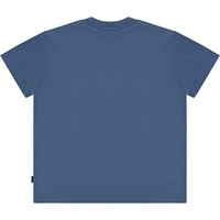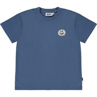 Blaues T-Shirt mit Frontdruck. Der Aufdruck ist eine kleine graue Sprechblase, die an der Seite sitzt und fröhliche und süße Dinge zu dir sagt. Dieses T-Shirt besteht aus 100% Öko-Baumwolle, hat kurze Ärmel, einen Rundhalsausschnitt mit Rippbündchen und eine normale Passform.