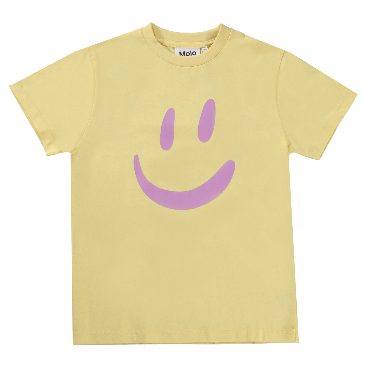 Gelbes T-Shirt mit Frontdruck. Der Druck ist ein breites Lächeln in Lila. Dieses T-Shirt besteht aus 100% Öko-Baumwolle, hat kurze Ärmel, einen Rundhalsausschnitt mit Rippbündchen und eine normale Passform.
