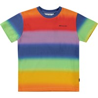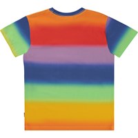 Hier ist das T-Shirt Roxo mit Allover-Regenbogendruck. Das T-Shirt besteht aus 100 % Öko-Baumwolle.
