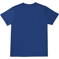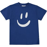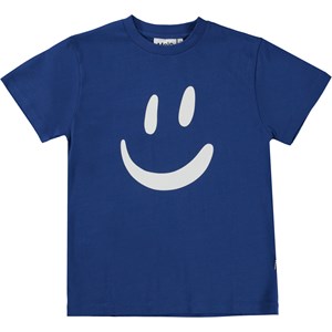 Blaues T-Shirt mit Frontdruck. Der Aufdruck ist ein breites Lächeln in Weiß. Dieses T-Shirt besteht aus 100% Öko-Baumwolle, hat kurze Ärmel, einen Rundhalsausschnitt mit Rippbündchen und eine normale Passform.