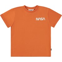 Orangefarbenes T-Shirt mit weißem NASA-Frontprint. Auf der Seite ist „Space for All“ in Weiß aufgedruckt. Dieses T-Shirt besteht aus 100% Öko-Baumwolle, hat kurze Ärmel, einen Rundhalsausschnitt mit Rippbündchen und eine normale Passform.