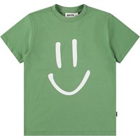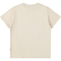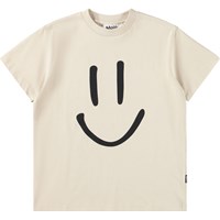 Beiges T-Shirt aus weicher Bio-Baumwolle mit kurzen Ärmeln und geripptem Halsausschnitt. Das T-Shirt hat eine lockere Passform mit einem Aufdruck eines lächelnden Gesichts.