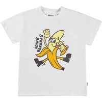 Roxo ist ein weißes Unisex-T-Shirt mit dem Aufdruck einer lustigen Banane und dem Text „Going bananas“. Das T-Shirt hat kurze Ärmel und einen Rundhalsausschnitt.