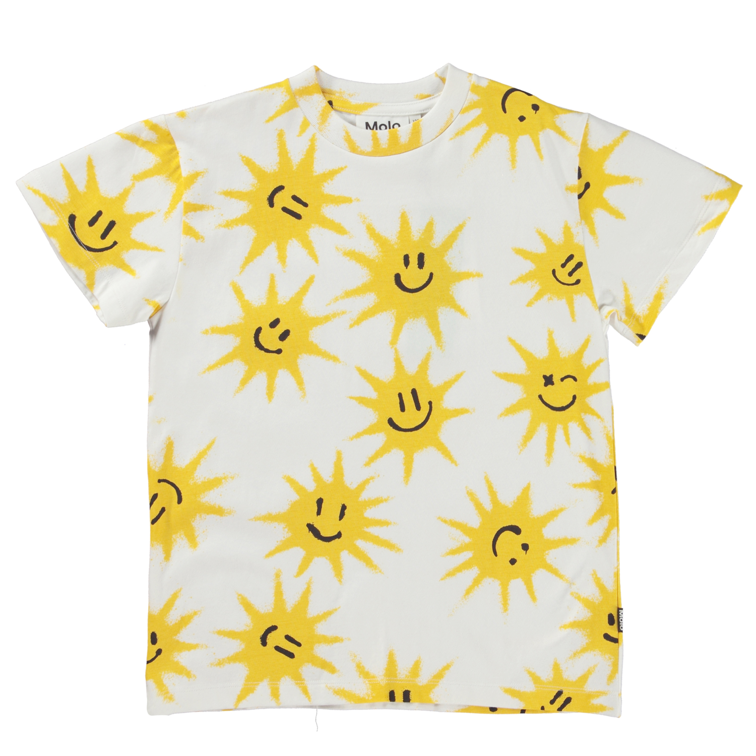 Roxo ist ein weißes Unisex-T-Shirt mit einem Aufdruck kleiner gelber Sonnen, die lächeln. Das T-Shirt hat kurze Ärmel und einen Rundhalsausschnitt.