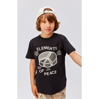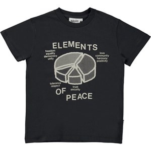 Roxo ist ein schwarzes Unisex-T-Shirt mit dem Text „Elements of Peace“ und dem Aufdruck eines Tortendiagramms, das zeigt, was nötig ist, um Frieden zu erreichen. Das T-Shirt hat kurze Ärmel und einen Rundhalsausschnitt.