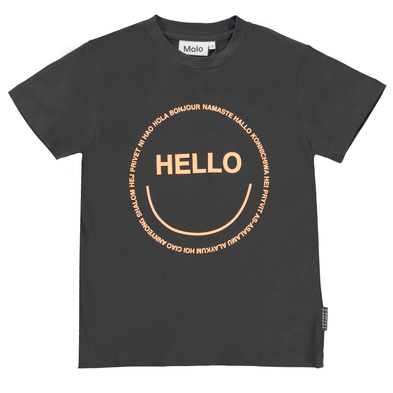 Roxo ist ein schwarzes T-Shirt mit einem Smiley-Aufdruck und dem Text „Hallo“. Das T-Shirt hat kurze Ärmel und einen Rundhalsausschnitt.