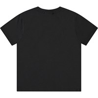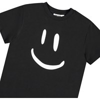 Schwarzes Öko-Baumwoll-T-Shirt mit kurzen Ärmeln und geripptem Ausschnitt. Das T-Shirt hat eine lockere Passform und ein großes weißes lächelndes Gesicht auf der Vorderseite.