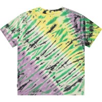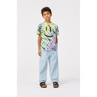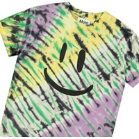 Bunt gefärbtes T-Shirt im Batik-Look aus Öko-Baumwolle mit kurzen Ärmeln und geripptem Ausschnitt. Das T-Shirt hat eine lockere Passform und ein großes lächelndes Gesicht auf der Vorderseite.Unser gesamter Batik-Look wird von Hand gefertigt und erzeugt ein einzigartiges Muster, das von Stil zu Stil variiert.