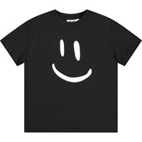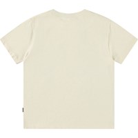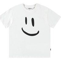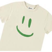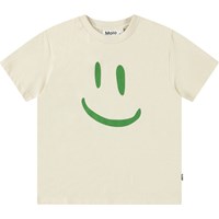 Weißes T-Shirt aus Öko-Baumwolle mit kurzen Ärmeln und geripptem Ausschnitt. Das T-Shirt hat eine lockere Passform und ein großes grünes lächelndes Gesicht auf der Vorderseite.