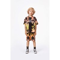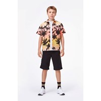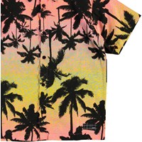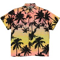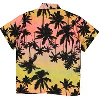 Rass ist ein Hemd mit Palmen-Druck auf einem roten und gelben Hintergrund. Das Hemd ist aus Baumwolle und hat Knopfverschluss.