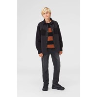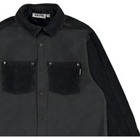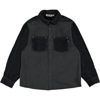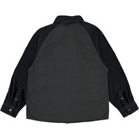 Rhyme ist ein schwarzes Hemd mit Samtärmeln, Kragen und Taschen. Das Hemd hat vorne Reißverschlüsse.