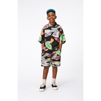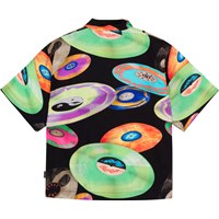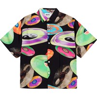 Schwarzes T-Shirt aus Viskose mit 80er-Jahre-Touch. Das Hemd hat eine lockere Passform, lange, lockere T-Shirt-Ärmel, einen Knopfverschluss vorne mit weißen Knöpfen und einen klassischen Hemdkragen. Das Shirt hat einen Allover-Print aus neonfarbenen fliegenden Platten. Kombinieren Sie es mit passenden Shorts und erhalten Sie ein cooles Set.