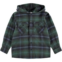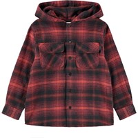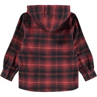 Schwarzes und rotes kariertes Overshirt aus Baumwolle mit Kapuze, langen Ärmeln, schwarzen Knöpfen, zwei Brusttaschen und einer regulären Passform.