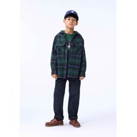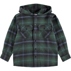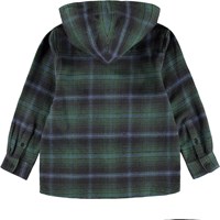 Grünes, schwarzes und blaues kariertes Hemd aus Baumwolle mit Kapuze, langen Ärmeln, blauen Knöpfen, zwei Brusttaschen und einer regulären Passform.